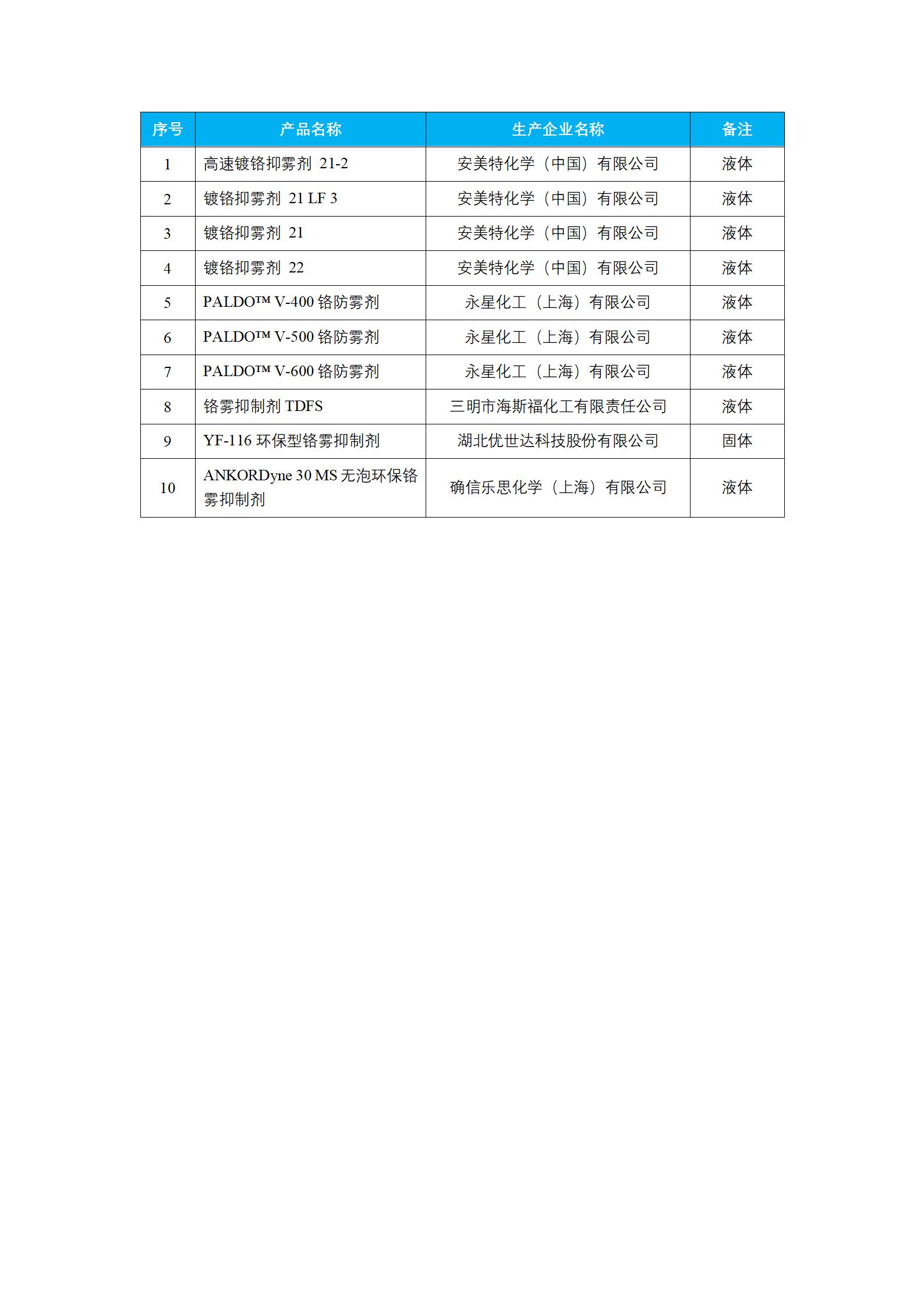 中国市场上的 PFOS 铬雾抑制剂产品清单(负面清单)